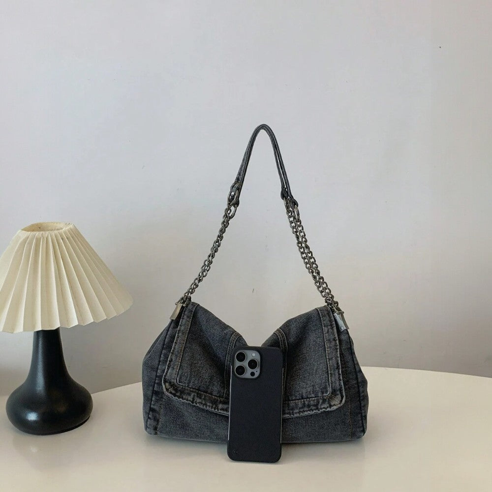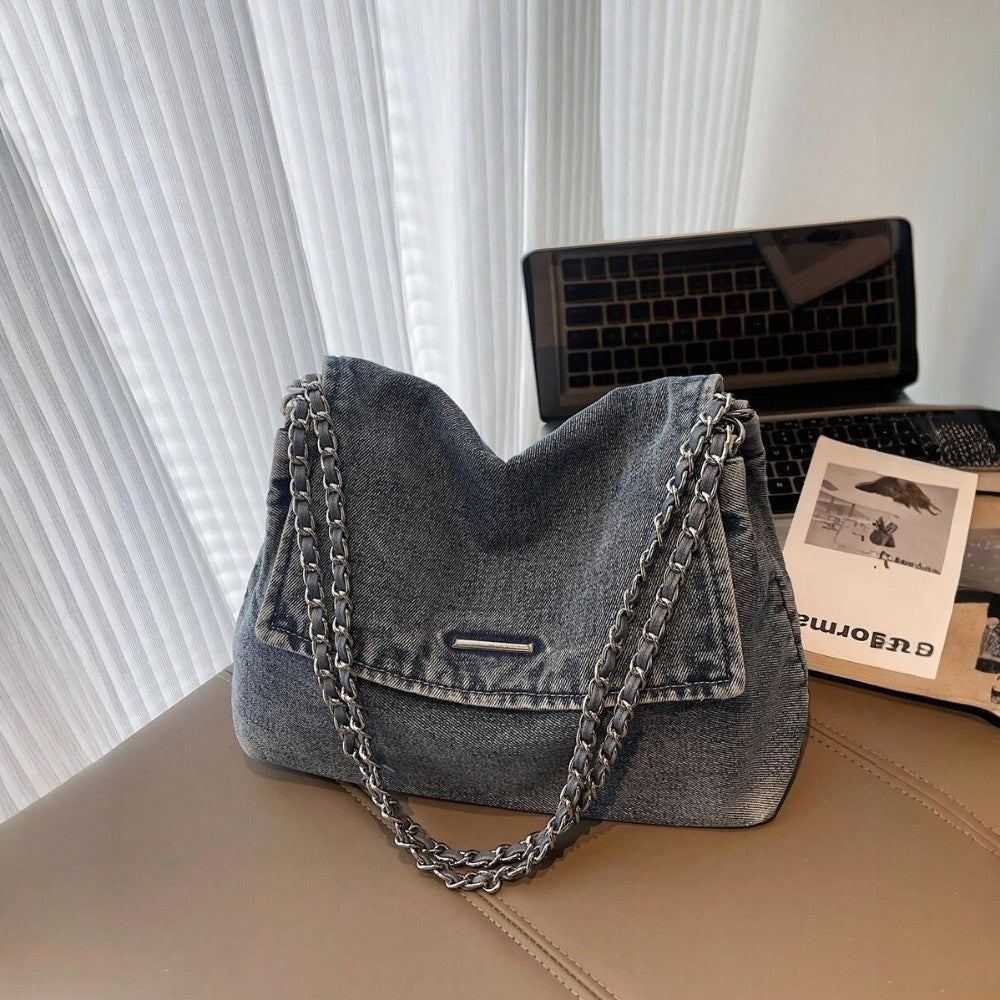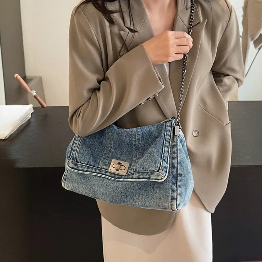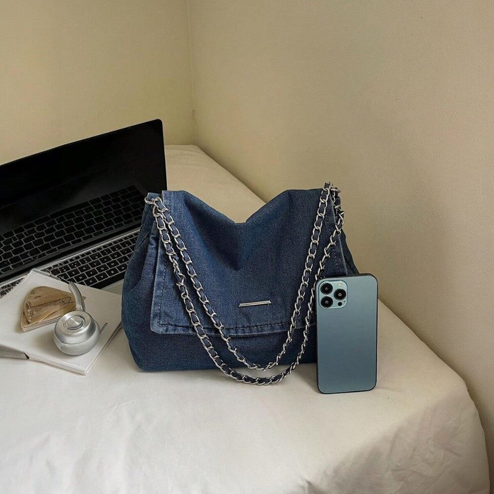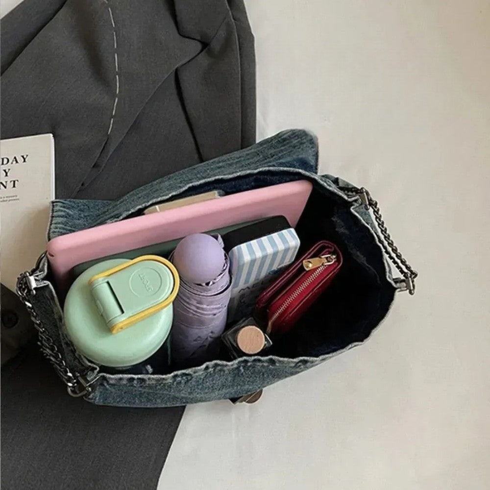 La nostra borsa Grace è realizzata in denim di alta qualità, combinando uno stile casual con la durabilità. Progettata per essere abbastanza capiente, ospita facilmente i tuoi essenziali: laptop, trucco e accessori quotidiani.