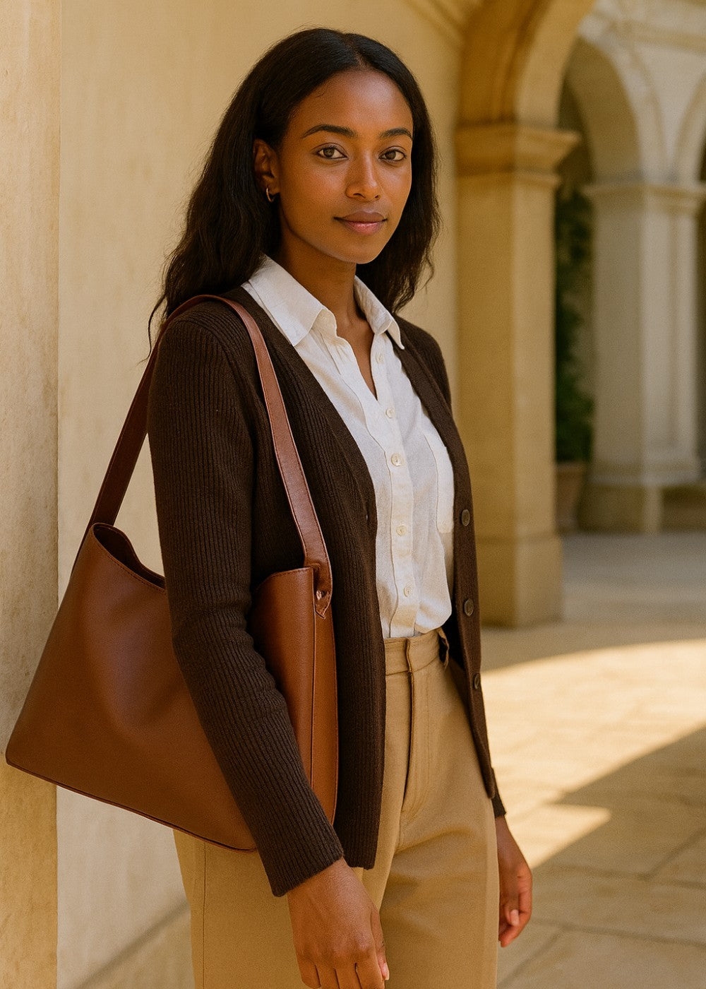 Realizzata in pelle vegetale di alta qualità e progettata per essere abbastanza spaziosa da contenere il tuo laptop, il taccuino e l'intera collezione di trucchi.